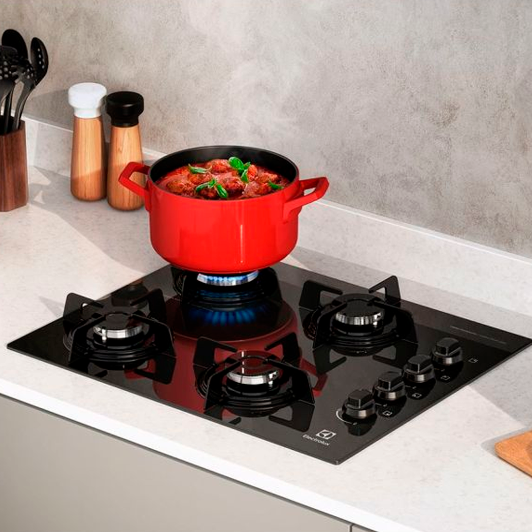 El Anafe a Gas 4 Hornallas Vidrio Negro de Electrolux combina diseño sofisticado, funcionalidad y durabilidad para satisfacer las exigencias de cocinas profesionales y de uso doméstico de alta gama. Su superficie de vidrio templado facilita la limpieza y aporta una estética moderna que se integra con cualquier estilo de cocina. Equipado con cuatro hornallas selladas que incluyen una hornalla triple llama, ofrece potencia y versatilidad para preparar desde cocciones lentas hasta salteados rápidos. El encendido super automático asegura una ignición rápida y segura sin necesidad de fósforos o encendedores externos. Además, el sistema de bloqueo de gas proporciona una capa adicional de seguridad, cortando el suministro en caso de apagado accidental de la llama. Sus rejillas individuales de acero esmaltado soportan ollas y sartenes de gran peso, mientras que el termómetro analógico integrado permite un monitoreo sencillo de la temperatura ambiente bajo la cubierta.