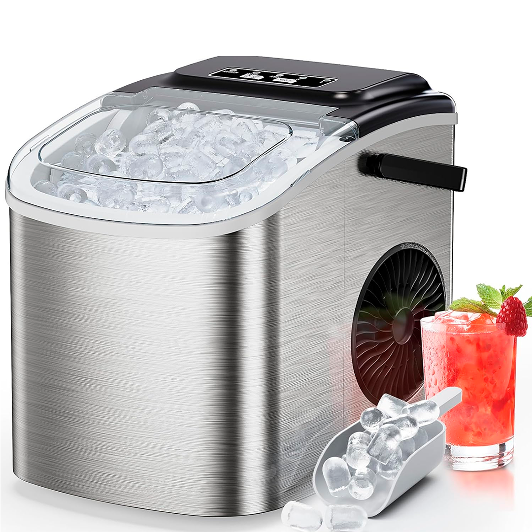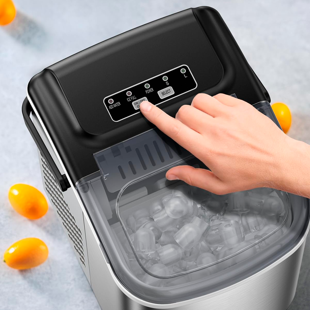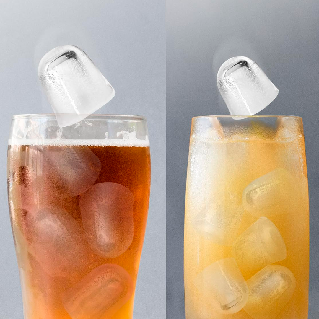 El tanque de agua de 1,3 litros y la capacidad de almacenamiento de 0,6 kg de hielo permiten mantener un flujo constante de hielo sin recargas frecuentes. Además, podés elegir entre dos tamaños de cubito, adaptándolos a tus necesidades: desde bebidas individuales hasta el enfriamiento de botellas y jarras.