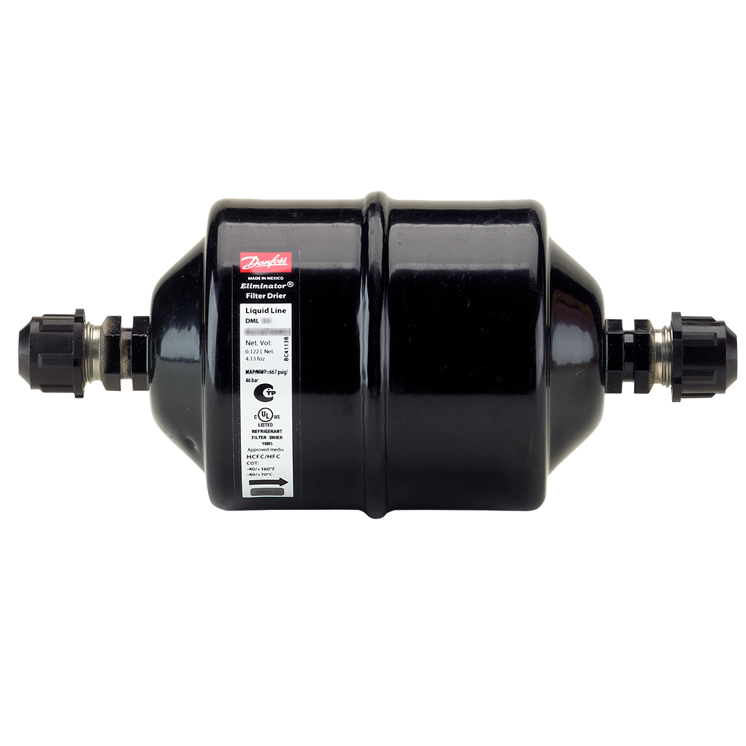 El filtro secador DML 164 Danfoss, pertenece a la línea ELIMINATOR® DML de secadores herméticos para línea de líquido con conexiones flare. Con un diseño de núcleo sólido de 16 cu.in. (~7.84 in³), este filtro ofrece capacidad excepcional de eliminación de humedad y contaminantes en sistemas de refrigeración y aire acondicionado, especialmente optimizado para refrigerantes HFC y aplicaciones sin aceite.