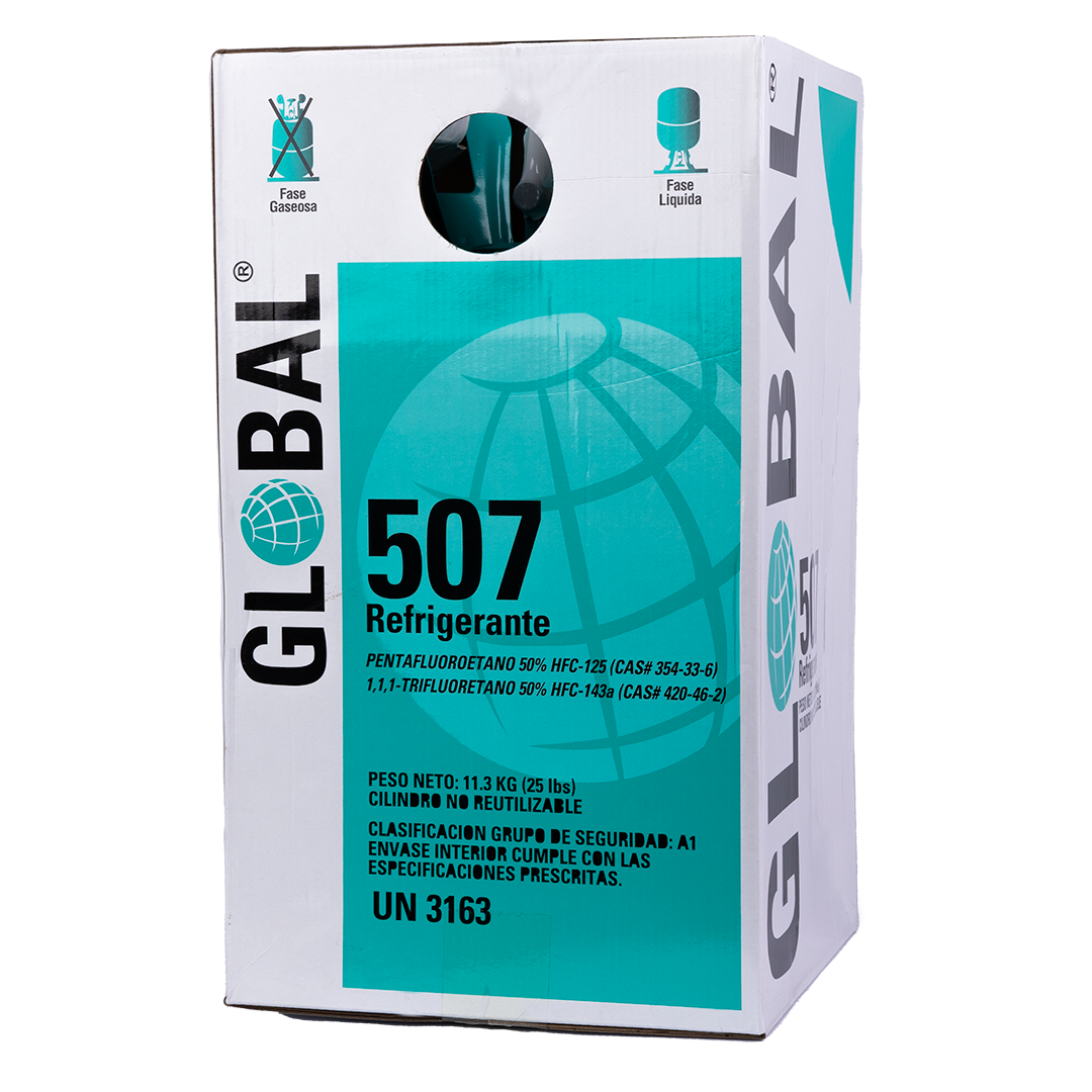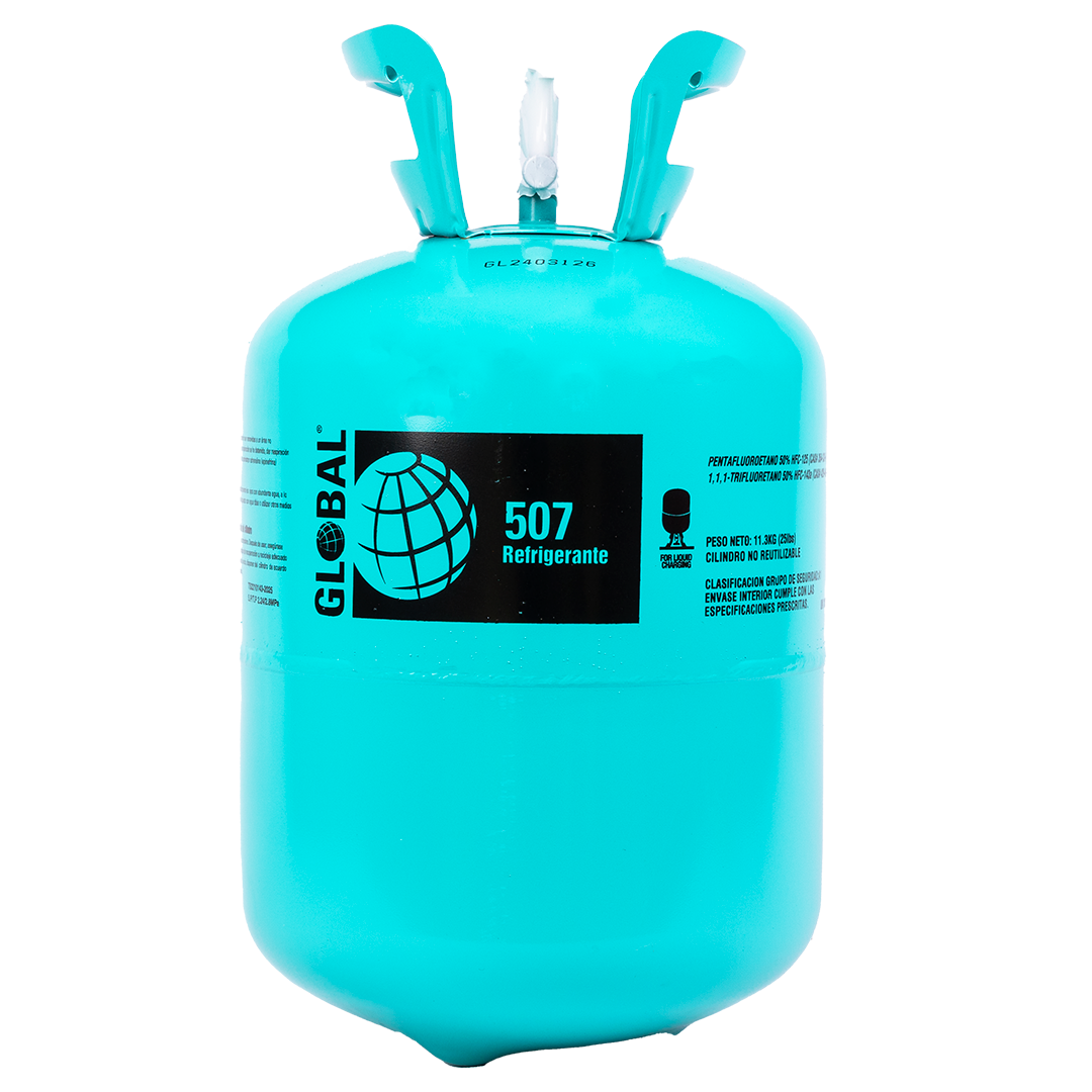 El Gas Refrigerante R507 en presentación de 11,3 kg es una mezcla azeotrópica de hidrofluorocarbonos HFC R-125 y R-143a (50/50), diseñada para reemplazar al R-502 en sistemas de baja y media temperatura. Esta solución es ampliamente usada en supermercados, cámaras frigoríficas, transportes refrigerados y plantas de proceso alimentario, gracias a su estabilidad química, cero potencial de destrucción de ozono (ODP = 0) y seguridad en operación.