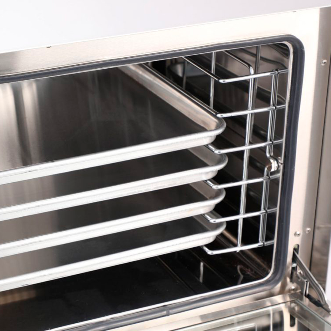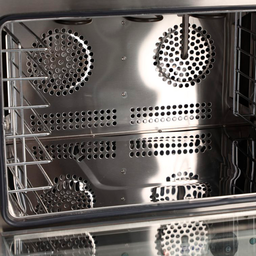 El diseño de doble ventilador y la cámara de acero inoxidable permiten cocciones más rápidas y uniformes, optimizando el flujo de trabajo en cocinas de alto volumen. -
