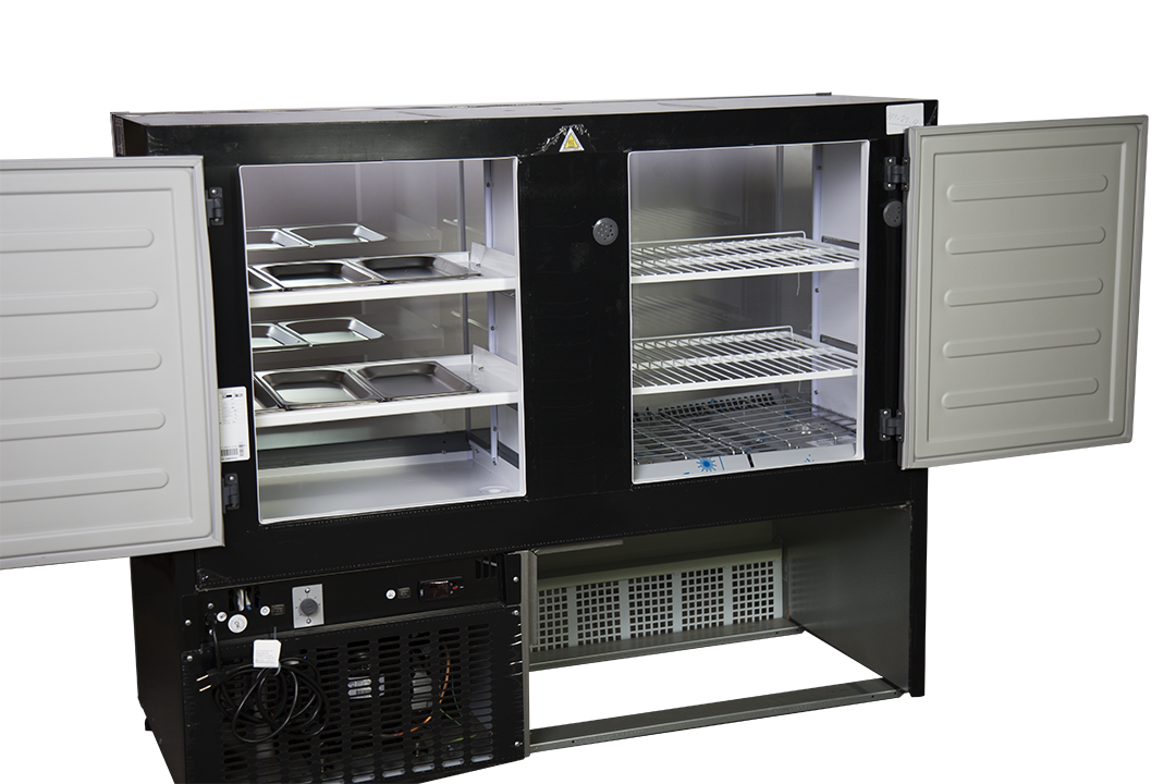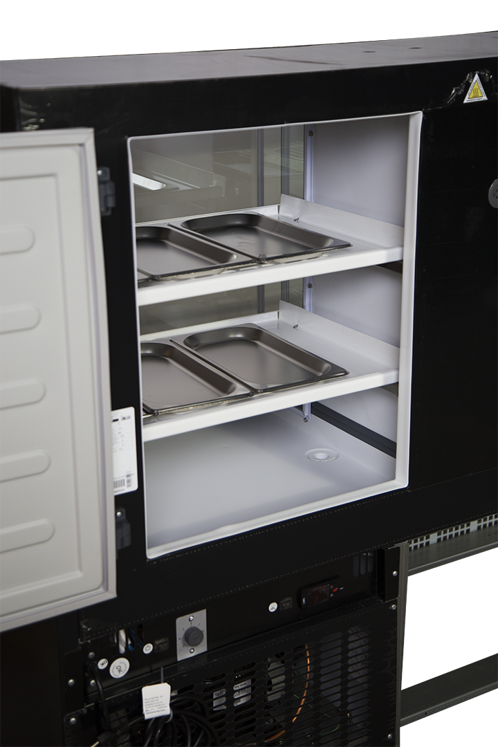 Rango de Temperatura: Ofrece un lado refrigerado con un rango de 0 °C a +7 °C y un lado calentado que alcanza entre +30 °C y +65 °C, permitiendo mantener productos a la temperatura adecuada para su conservación y consumo.