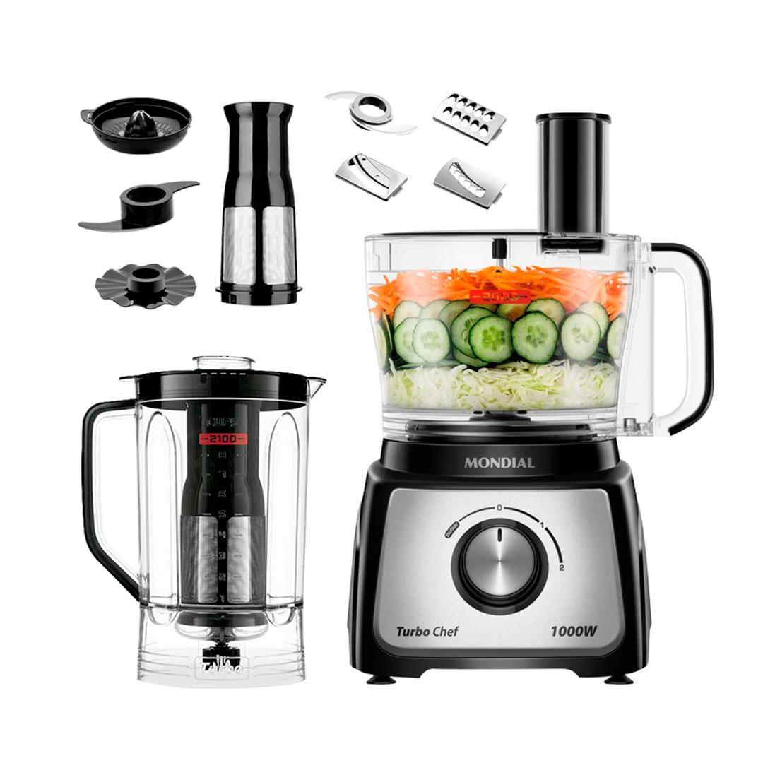 El Multiprocessador 9 en 1 Turbo Chef es un equipo de cocina diseñado para simplificar tus tareas culinarias con un único dispositivo. Con una potencia de 1.000 W, este multiprocesador te permite triturar, picar, batir, mezclar, fatiar, rallar, exprimir y mucho más, gracias a sus múltiples accesorios y funciones versátiles. Su diseño inteligente y funcional lo convierte en un aliado ideal para quienes quieren optimizar espacio, reducir aparatos en la cocina y lograr resultados profesionales en preparaciones cotidianas.