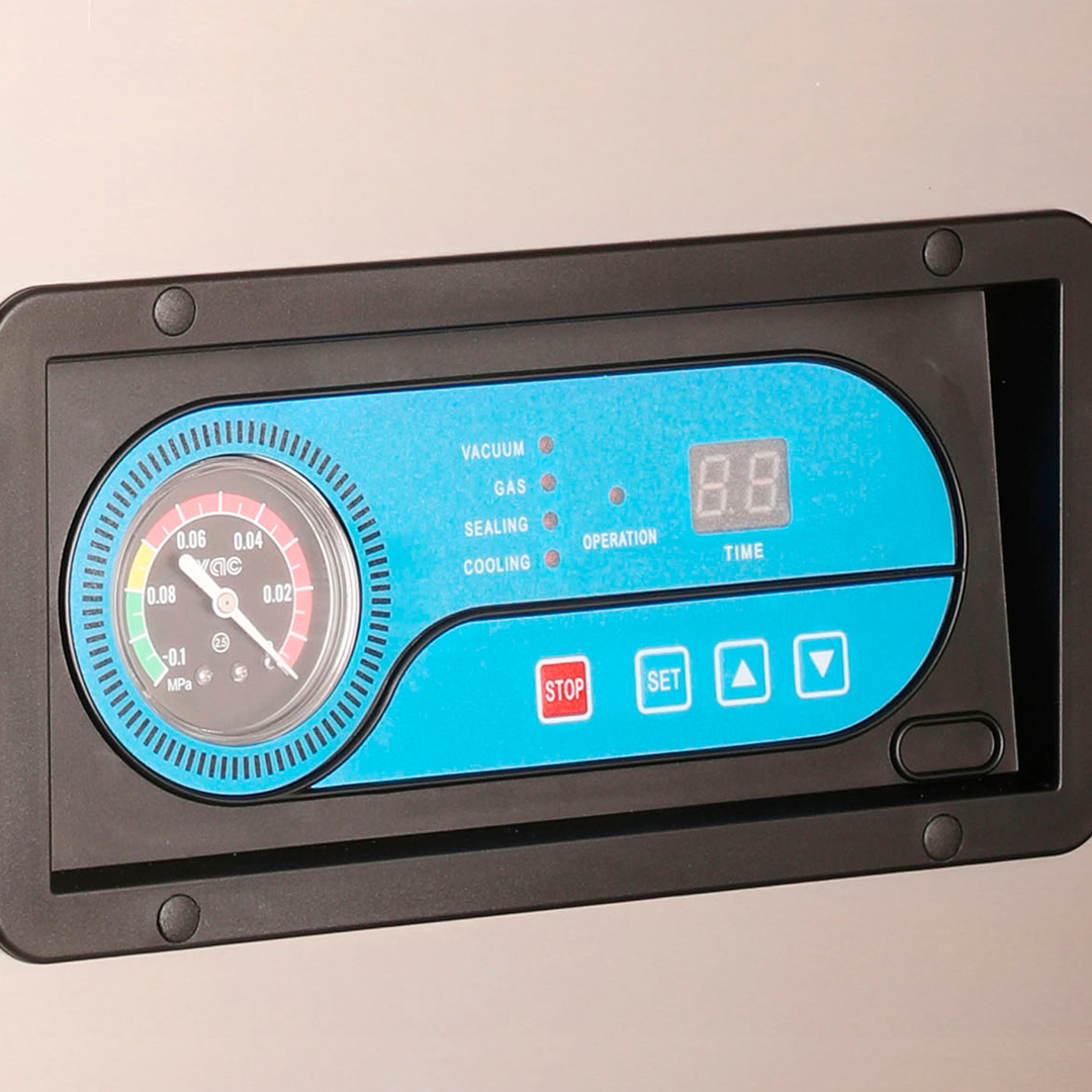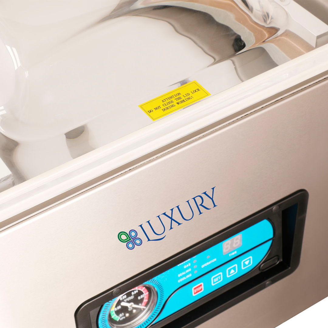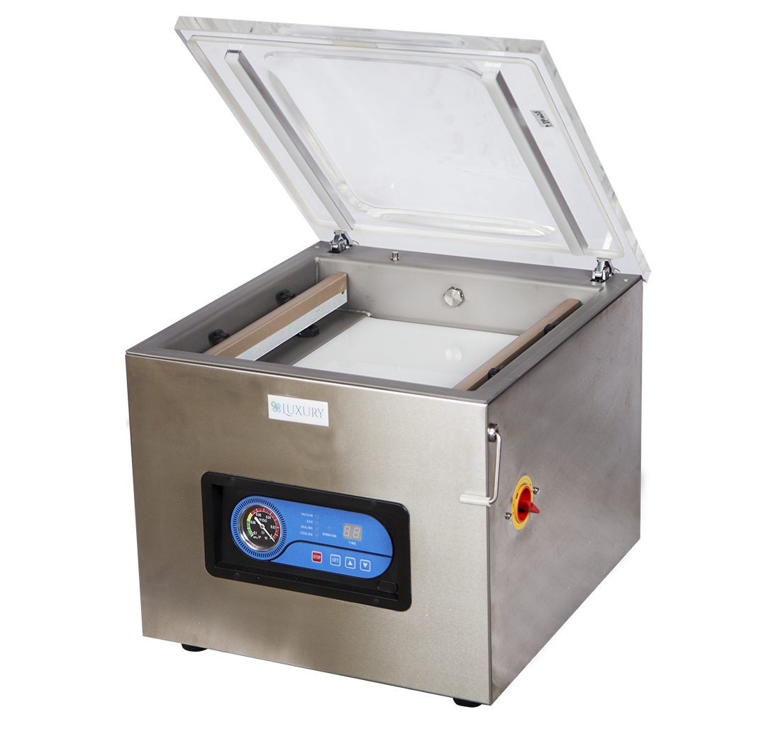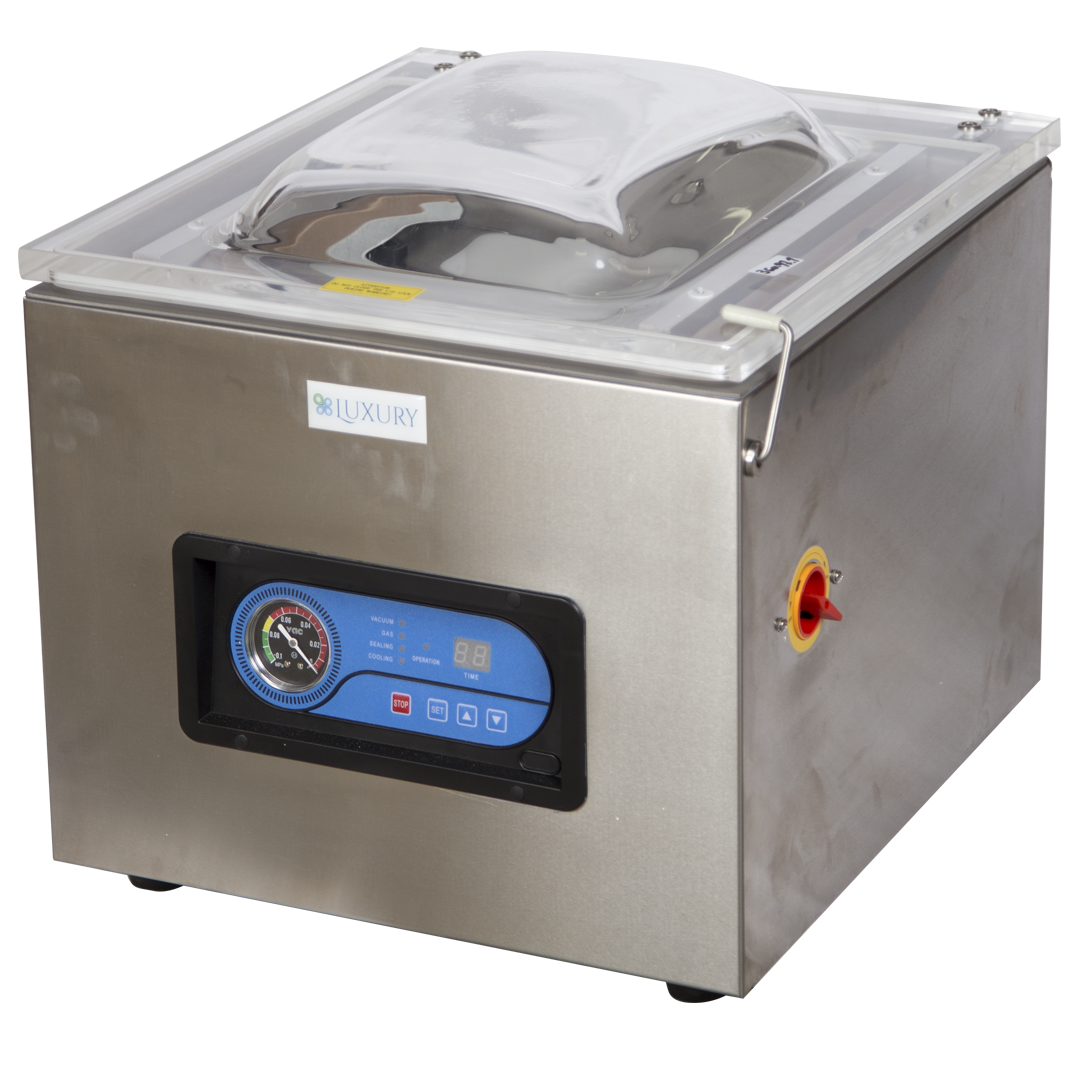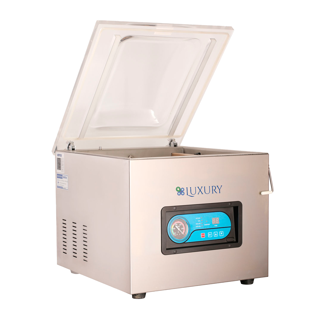 La Selladora al vacío Luxury es una máquina compacta y versátil, ideal para almacenes, carnicerías, hoteles y restaurantes. Incorpora doble banda de sellado, marcador de fecha y kit de repuestos, que permiten envasar de forma hermética productos secos y húmedos, manteniendo su frescura, sabor y propiedades nutricionales hasta cinco veces más que el almacenaje convencional. Su tapa transparente de policarbonato, cámara interior de acero inoxidable y exterior pintado garantizan durabilidad y total visibilidad del proceso.